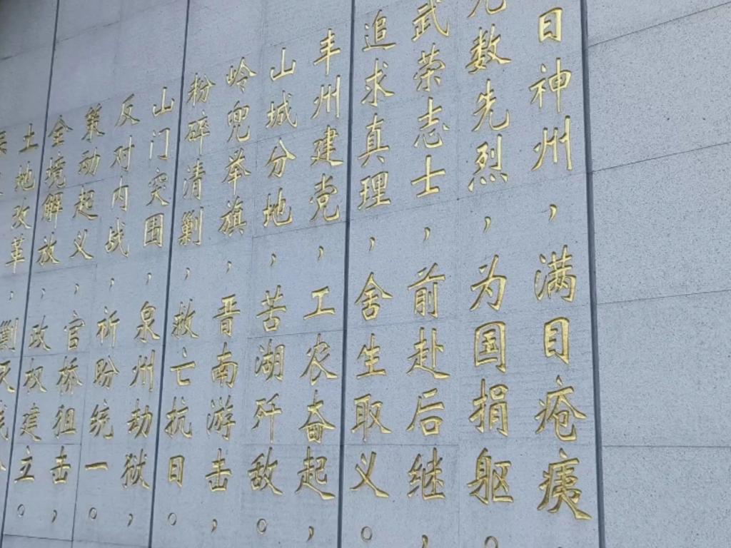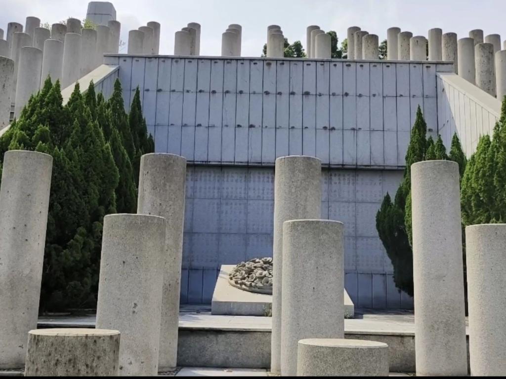 随后,来到悼念广场。纪念碑是悼念广场的核心,碑身方柱体岿然耸立,碑角四棱内收成八角挺直而上。纪念碑正面向东南,主体旋转错动分为四段,代表四个不同历史时期的转折:碑体由下而上第一部分代表红军时代;第二部分代表抗日战争时代(以新四军为代表);第三部分代表解放战争时代;各部分刻有不同时期的人物主题浮雕,以上三部分寓意为新中国建立而奠基;第四部分为新中国成立以后,刻有国徽浮雕。统观全碑,挺拔高耸,造型凝重,风格淳朴雄浑,衬上碑后弧墙,碑周青松,给人以温和严肃和万世不朽之感。