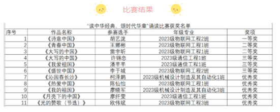 此次活动的圆满结束,进一步传承和弘扬中华优秀传统文化,激发了同学们的爱国热情,增强了同学们的主题教育学习,展现了信息学子们青春昂扬的精神风貌。希望同学们以本次红色经典诵读大赛为契机,将红色经典诵读融入到党史学习中,树立正确的人生观和价值观,坚定理想信念,为实现中华民族伟大复兴的中国梦贡献青春力量。