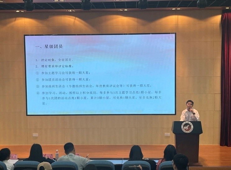 第五部分是星级团员和星级团支部增星要求和评定标准以及团的活动星级的要求,在此基础上,赖金城同学还说明了团校参训的条件和五四表彰评选规则。
