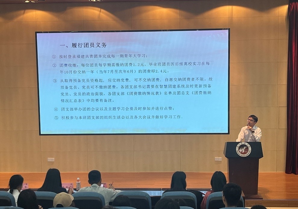 紧接着是团支部活动和团员职责。赖金城同学围绕团支部活动的注意事项和善后工作展开介绍,对团员应履行的责任及可能遇到的问题进行了详细的解释说明。