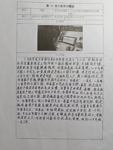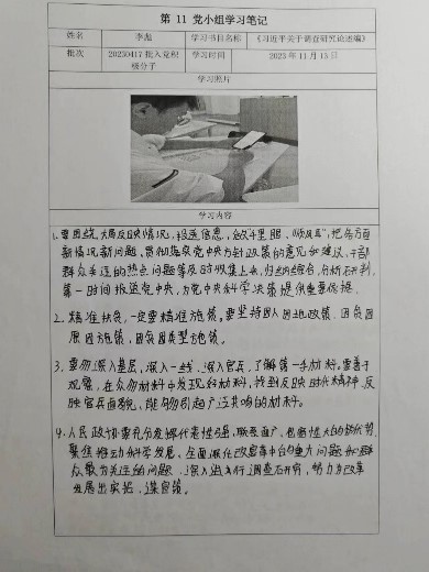 随后,员工党支部组织委员练小慧老师带领第11党小组共同学习《习近平关于调查研究论述摘编》中的“调查研究要注重实效,真正把情况摸实摸透”篇目,并以习近平总书记在福建担任市委书记、地委书记期间走遍了福州、宁德等基层乡镇为例,强调调查研究的必要性、真实性、针对性、及时性。总书记曾言:“基层跑遍、跑深、跑透了,我们的本领就会大起来。”以此指导组员进行调查研究,发掘深层次细节问题。
