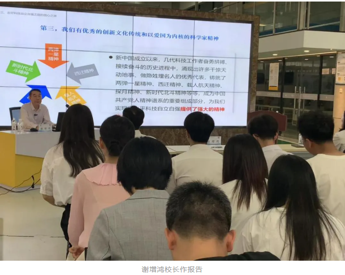 在专题报告环节,公司董事长谢增鸿为全体师生作“发展新质生产力,走好科技自立自强之路”的主题报告。报告从新质生产力与科技创新的关系、科技支撑我国现代化建设的历史进程、走好科技自立自强之路的底气与信心、科技强国新征程中的青年担当等四个方面进行论述,强调新质生产力代表一种生产力的跃迁,其特点是创新,关键在质优,本质是先进生产力,希望同学们胸怀国之大者,坚定报国意志,锤炼过硬本领,以更加强烈的历史主动精神投入中国式现代化建设,在推进强国建设、民族复兴伟业中绽放青春光彩。
