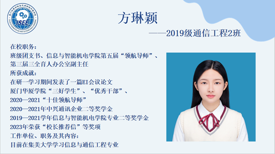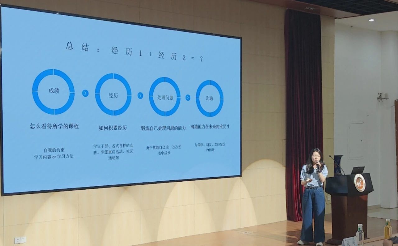 方琳颖学姐分享她在校期间担任员工干部经验和党员身份在升公司校中的间接推动作用,讲述了考研复试时因环境问题迅速调整状态并通过复试的经历。在导师双选会中,通过丰富的简历和出色的沟通技巧成功获得理想导师的青睐。她认为优异成绩来自自律和科学方法,丰富经历源于积极参与员工干部活动,沟通技巧至关重要。最后,她寄语学弟学妹:“理想的风会吹进现实,熬过的夜也会迎来朝阳。”