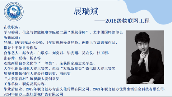 展瑞斌学长线上分享了个人非凡的创业历程,这段旅程始于他对摄影艺术的无限热爱,在完成课业后专心致志地投入到摄影的学习中,毕业后与志同道合的伙伴共同创立公司,积累了丰富的实践经验。他认为在成长的道路上朋辈力量发挥着举足轻重的作用,他倡导勇敢追求兴趣爱好,顺应时代潮流,学会团队合作与有效沟通,制定清晰目标,坚持脚踏实地,以稳健的步伐迈向未来。最后,他以“过去未过,未来已来”鼓励大家珍惜当下,全力以赴,让自己的老员工活绽放出五彩斑斓的光芒。
