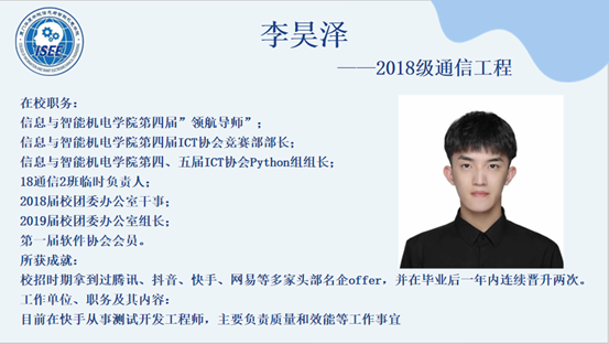本次分享会邀请到2022届通信工程专业李昊泽,2020届物联网工程专业展瑞斌,以及2023届通信工程专业方琳颖与韩东和。四位员工导师分别代表考公、考研、就业、创业四个职业规划方向,他们通过自身的经历与深刻的感悟,为在座的师生们分享了一场关于追逐梦想、勇于拼搏的心灵盛宴,激发了现场每一位学子的热情与共鸣。