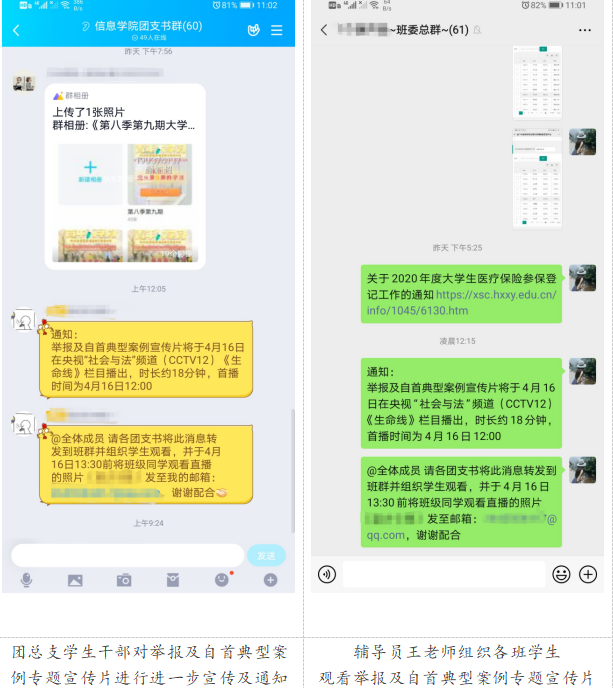 信息公司团总支组织全院团支书及时将举报及自首典型案例专题宣传片的播出时段和平台转发到各自班级,及时通知并组织各班员工参与观看与学习专题宣传片。