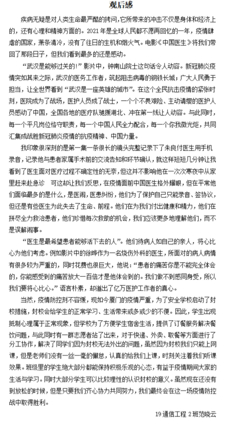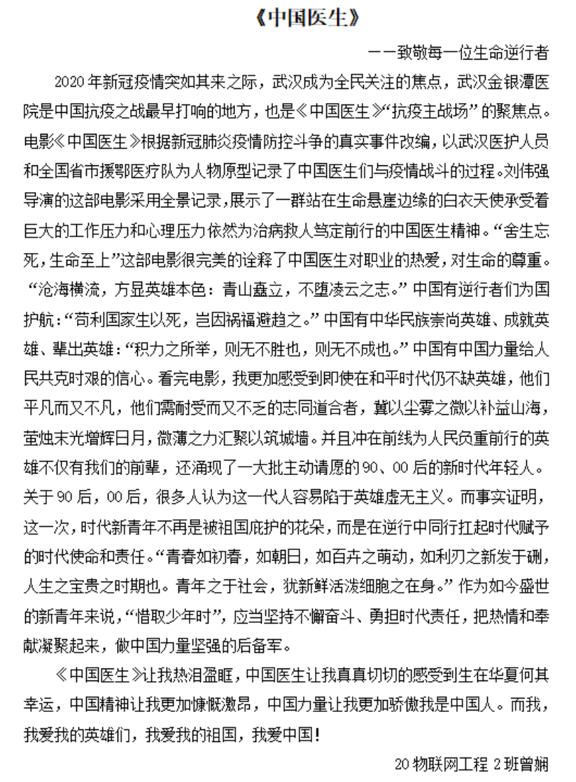 通过本次观看同学们了解到了全国人民在面对疫情时紧紧团结一心、同舟共济的精神风貌,突显了“生命至上,举国同心,舍生忘死,尊重科学,命运与共”的伟大抗疫精神。以下是此次活动的获奖名单。