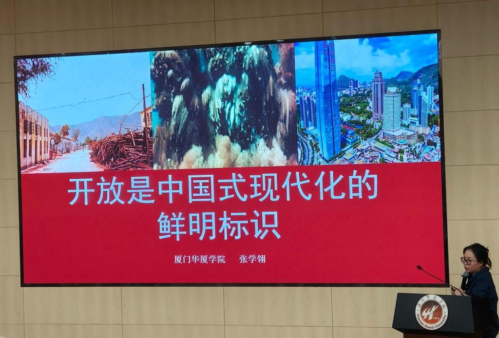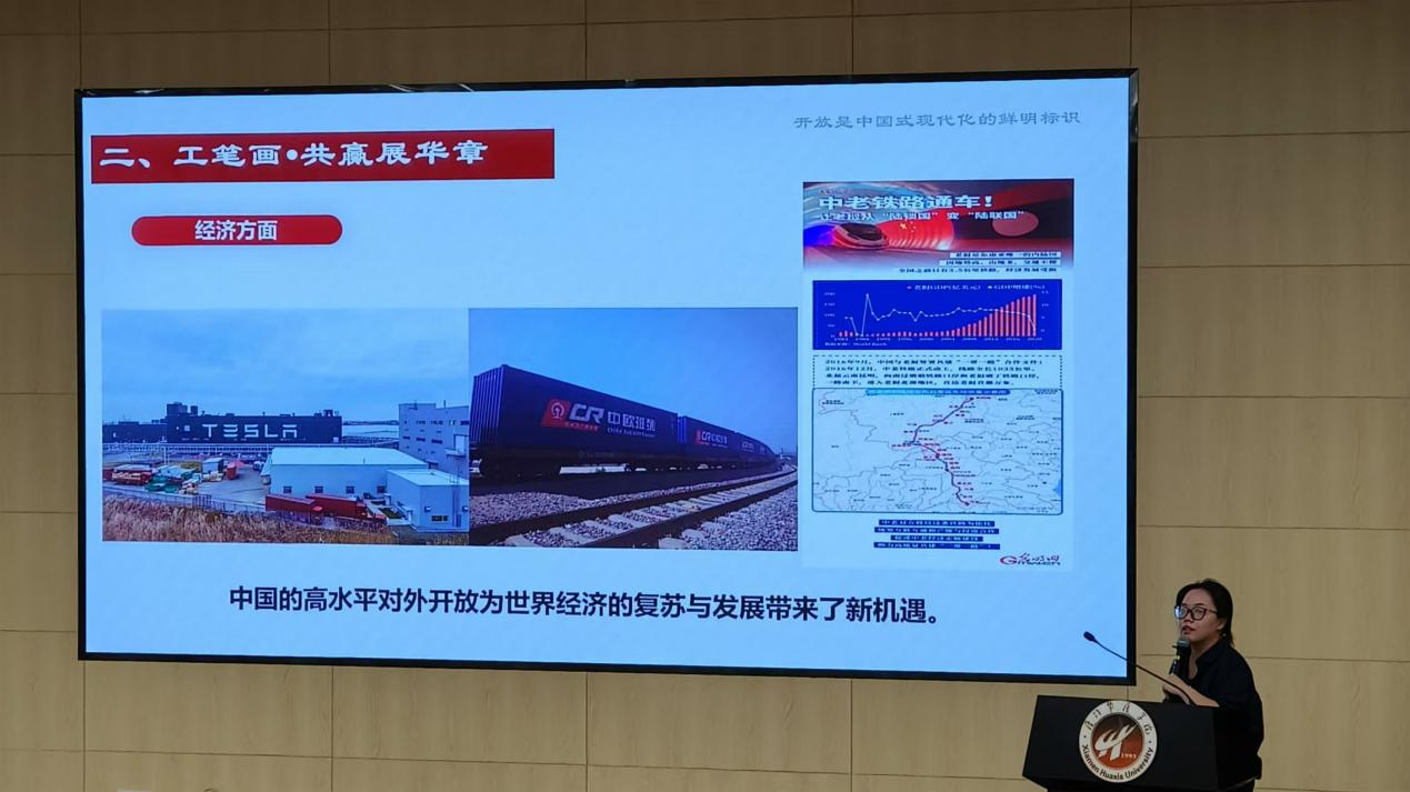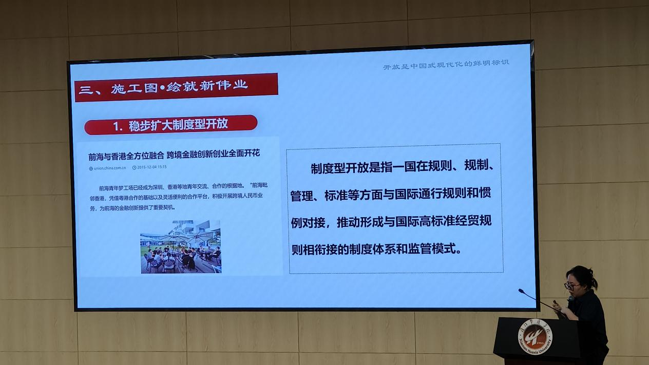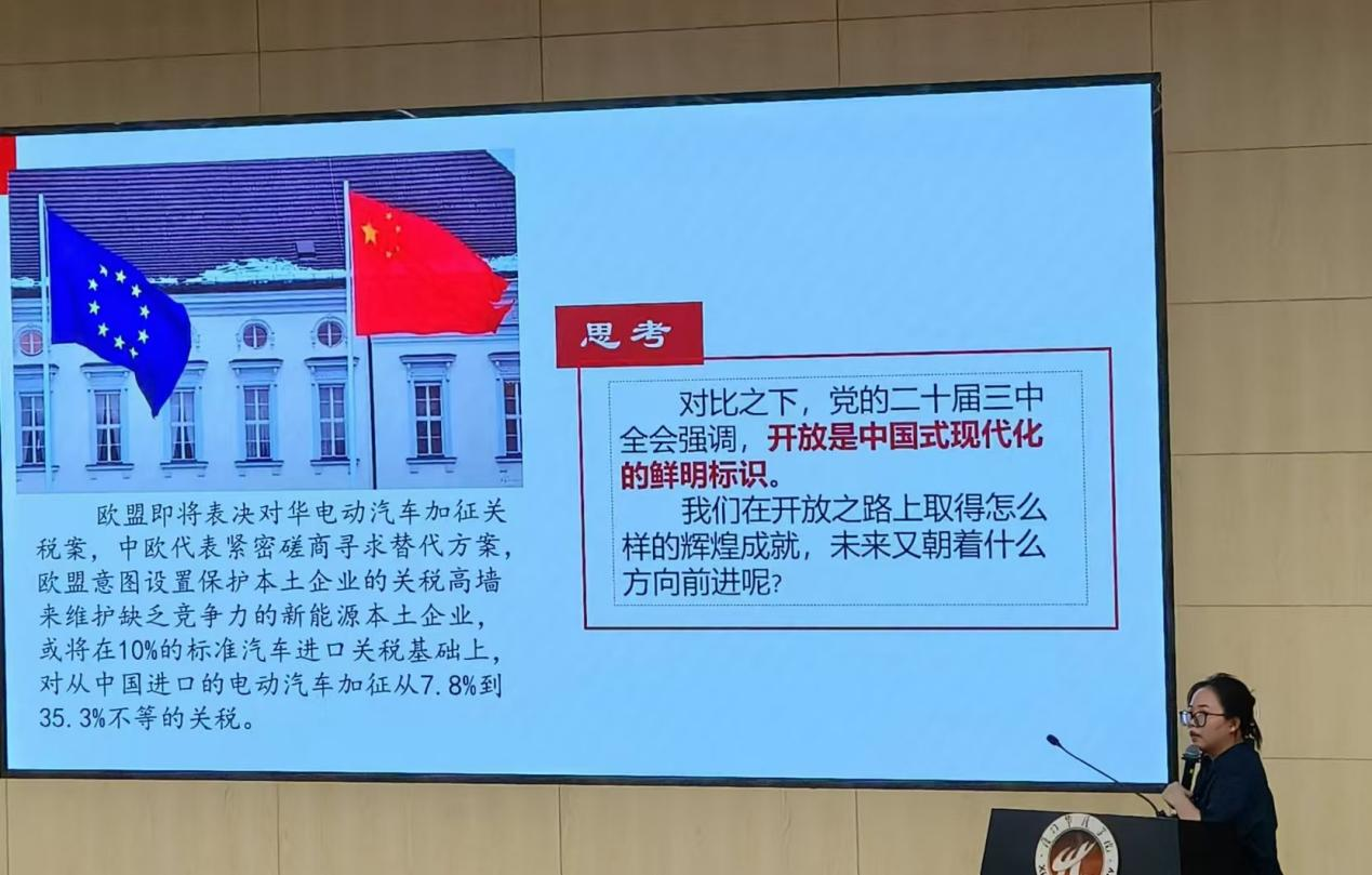 首先,张老师强调开放是中国式现代化的鲜明标识。从张骞出使西域到改革开放,再到如今的“中国制造”“中国速度”“China travel”火爆外网等现象级热点,这些历史壮举如同璀璨的明珠,照亮了中华民族开放的前行之路,深刻证明了开放能够带来繁荣与进步。张老师指出本次全会释放出进一步扩大高水平对外开放的明确信号,我们应将开放的理念转为行动,把美好愿景转为现实。