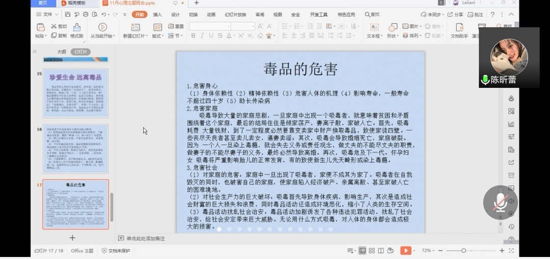 活动总结:通过讲解,丰富了本班员工的心理健康知识,教授同学人际交往的技巧。促使本班员工了解心理健康的价值和意义,破除同学对心理问题及心理咨询的误解,让同学们能正确对待心理问题及心理咨询,解答一些同员工活和学习中的实际问题,增强班级凝聚力。主讲人从自身、家庭、社会三个方面讲述了毒品的危害;并号召班级成员要积极宣传毒品的危害,自觉地与吸毒、贩毒等不法行为作斗争,珍爱生命,终身远离毒品、拒绝毒品!“远离毒品,关爱未来”,对每一个人而言,这决不仅仅是一句简单的口号。无论是出于主观还是客观,有些路,永远不能走;有的错,永远都不能犯!