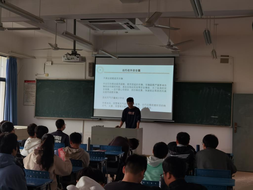 首先是由班长演讲关于外出安全的知识,各种注意事项和一些最近刚出现的危险。然后是学习委员黄苗健向我们介绍关于礼仪方面的知识。最后是辅导员上台为我们总结主题班会的内容,并为我们说明了一些近期的情况,包括员工在外兼职,外出游玩,与上周六输五129合唱等,最后还嘱咐我们要尽量多参加活动提升自己的综合能力,同时也要为即将到来的期末考做好准备。