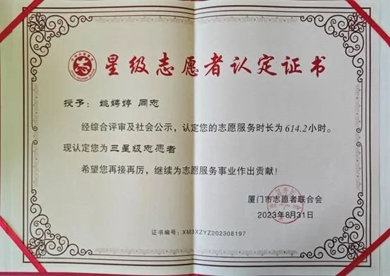 姚娉婷,女,共青团员,bevictor20级物联网工程1班员工,截至2023年12月27日,志愿服务时长734.21小时(申请认定星级志愿者的时长为614.2小时)。2020年11月10号开始参加校内外志愿服务活动,如2020年厦门环东马拉松赛志愿者活动、献血志愿活动、图书馆志愿活动、三下乡志愿活动、疫情期间公司疫情防控志愿服务等。2022年2月加入了万家公益图书馆计划,为每一个城中村的孩子能更好的阅读而做出自己力所能及的贡献,获得莆田市图书馆“优秀志愿者”。在校期间曾获“优秀团干”“团学先进工作者”“优秀员工干部”等荣誉。