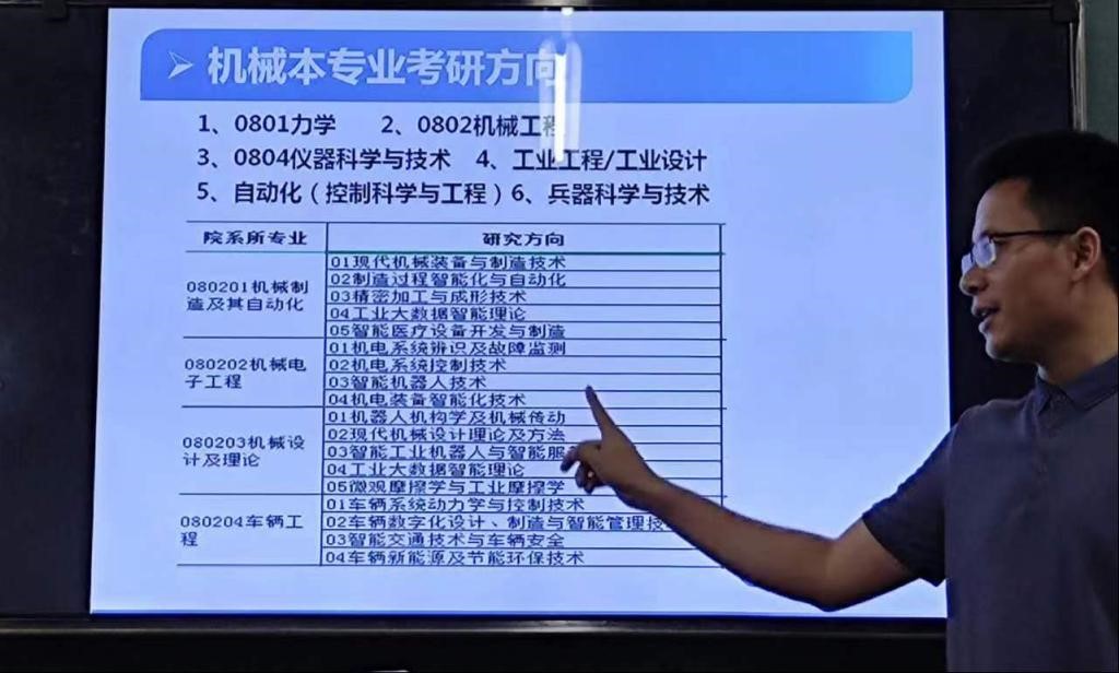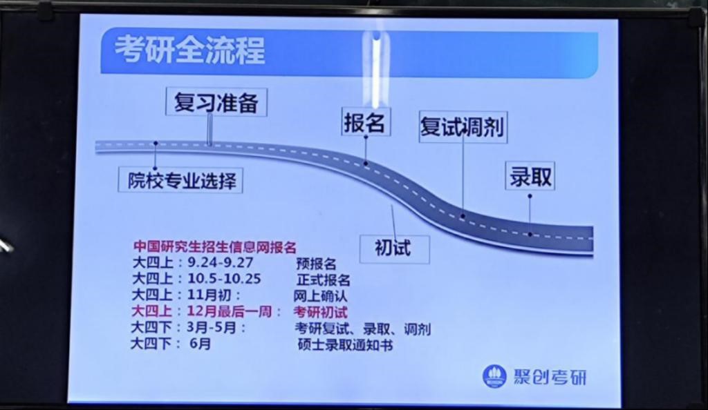 讲座中期,廖老师为同学们讲解考研的一系列问题。从院校专业的选择到初试、复试、调剂、录取的时间线等都为同学们展示出来。同时廖老师介绍了读研的大方向,非全日制和全日制读研的区别,学硕与专硕的区别,考研A区和B区的划分。接着廖老师详细介绍每一个专业的考研方向。